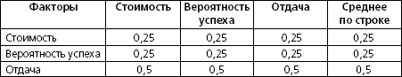 Средние значения строк представляют собой весовые коэффициенты, которые будут использоваться при умножении результатов аналогичных операций на значения стоимости, вероятности успеха и отдачи для каждого проекта.