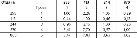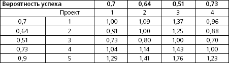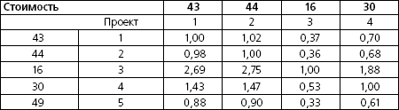 Подобная матрица предпочтений разрабатывается для каждого фактора всех проектов. Ниже приводится часть матрицы стоимости. Следует отметить, что высокая стоимость менее предпочтительна, чем низкая, поэтому значения стоимости для столбца делятся на аналогичные значения для строки, в результате в ячейках появятся значения, выражающие предпочтительность строки над столбцом (22) для каждого проекта. С целью экономии места показан только левый верхний угол всего массива (матрицы). Далее будут приведены аналогичные фрагменты матриц вероятности успеха и стоимости. Так как в случае этих факторов большая величина означает большую предпочтительность, значения для строки делятся на значения для столбца, формируя значения, отражающие предпочтительность фактора для строки над фактором для столбца (23).