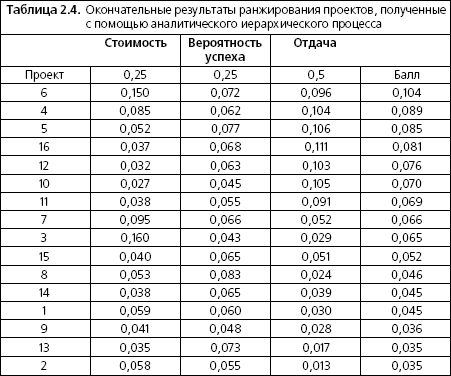 Вычисление рейтинга (оценки). Как и в случае одного массива предпочтений по трем критериям, теперь каждое значение каждого столбца во всех трех массивах делится на сумму значений соответствующего столбца и вычисляются средние значения по строкам. В табл. 2.4 показаны средние значения строк (внутри двойных линий) (21), веса каждого фактора, рассчитанные на первом шаге (в верхней строке таблицы), и окончательные оценки для каждого проекта в крайнем правом столбце. Эти оценки получаются путем умножения значений верхней строки таблицы (строки весов) на строку, соответствующую данному проекту, и последующего суммирования. Проекты упорядочены в порядке убывания общей оценки. Как и в случае модели ранжирования проектов, когда матрицы предпочтений сформированы руководством, а проектно-специфические данные предоставлены проектными командами или другими соответствующими группами, окончательный расчет тривиален при использовании электронных таблиц.