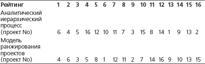 Как согласуются результаты применения моделей ранжирования проектов и AHP? В приводимой ниже таблице представлены результаты ранжирования проектов, полученные двумя различными методами (они являются повторением результатов, описанных ранее).