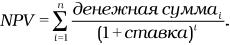В этой формуле денежная сумма i представляет собой сумму расходов и доходов в i-м году, а ставка – это выраженная в виде десятичной дроби величина ставки дисконтирования или процентной ставки, которую компания выплачивает за взятые в долг деньги.