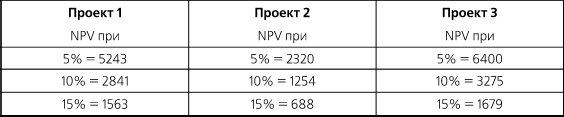 Чем сильнее обесценивание в будущем (то есть чем выше ставка дисконтирования), тем меньше NPV проекта. При любых ставках дисконтирования проект 3 превосходит оба оставшихся проекта. Следовательно, чем выше NPV, тем выше рейтинг проекта.