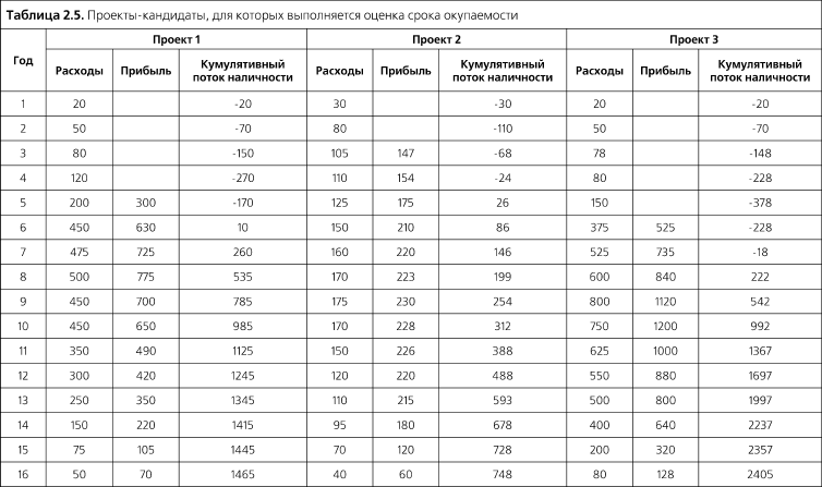 Время (срок, период) окупаемости – это просто промежуток времени между моментом инициации проекта и моментом, когда кумулятивный поток денежной наличности (доходы минус расходы) становится положительным и происходит возврат всех средств, инвестированных в проект. Как показано в табл. 2.5, (кумулятивный) поток наличности для проекта 1 становится положительным через шесть лет, для проекта 2 – через пять, а для проекта 3 – через восемь. Если смотреть по данному критерию, то проект 2 является наилучшим выбором.