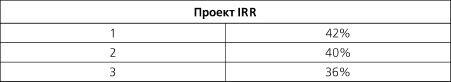 Согласно критерию IRR, проект 1 превосходит оба оставшихся проекта. Хотя этот метод выполняет дисконтирование будущих денежных сумм, он не принимает во внимание размер проекта. Проект 3 обещает значительно большую общую прибыль, чем проект 1, однако эта прибыль приходится на более отдаленное будущее и достижима после более длительного периода инвестиций (пока поток наличности примет положительное значение). Как следствие значение IRR для проекта 3 ниже, чем для проекта 1.