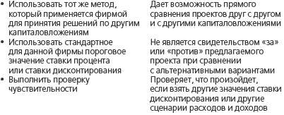 Как показывает приведенный пример, три рассмотренных метода могут дать различные результаты для одного и того же набора проектов. Выбор метода зависит от того, какие соображения являются наиболее важными для менеджера. NPV лучше работает в случае проектов с большой отдачей, но плохо защищает от неопределенностей будущих периодов. IRR также плохо защищает от неопределенностей и часто отдает предпочтение проектам со скромной общей отдачей, но с высокой прибылью при небольших инвестициях. Срок окупаемости является очень консервативным методом. Он лучше защищает от неопределенностей, но не принимает во внимание ни отдачу проекта, ни дисконтированную величину его будущих расходов и доходов. Итак, выбор метода определяет наиболее важное соображение. Больше того, поскольку эти методы рассматривают проекты как способы инвестиции капитала, в работе полезно использовать тот же метод, который компания применяет для оценки других своих капиталовложений, – это даст возможность непосредственного сравнения проектов между собой и с другими капиталовложениями.