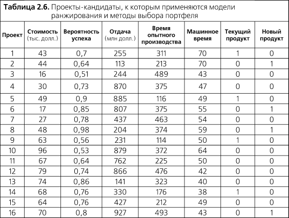 Конструирование модели портфеля. Проанализируем меню проектов, представленное в табл. 2.6. В дополнение к критериям выбора, использованным в примерах модели ранжирования проектов или аналитического иерархического процесса, примем во внимание взаимодействие проектов, чтобы получить портфель без конфликтов. Предположим, что бюджет ограничен величиной 600 тысяч долларов, максимально доступное время опытного производства составляет 4500 часов, а максимально доступное машинное время – 700 часов. Исходя из этих сведений, нужно составить такой портфель проектов, который обеспечит максимальную отдачу.