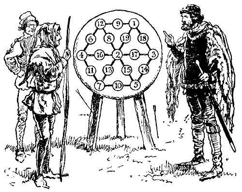 One day, when the archers were a little tired of their sport, Sir Hugh de Fortibus said, "What ho, merry archers! Of a truth it is said that a fool's bolt is soon shot, but, by my faith, I know not any man among you who shall do that which I will now put forth. Let these numbers that are upon the butt be set down afresh, so that the twelve lines thereof shall make twenty and three instead of twenty and two."