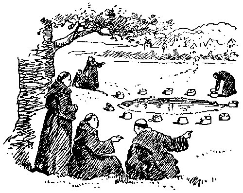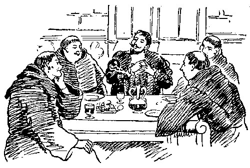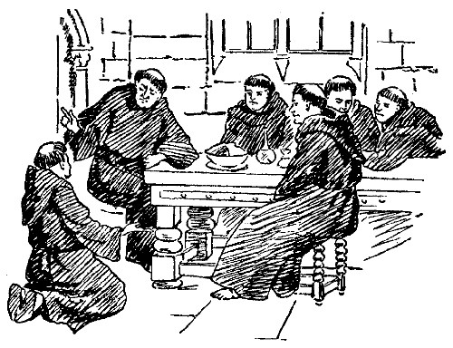 One day, when the monks were seated at their repast, the Abbot announced that a messenger had that morning brought news that a number of pilgrims were on the road and would require their hospitality.