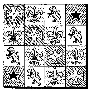 It seems that it was Friar Andrew who first managed to "rede the riddle of the Tiled Hearth." Yet it was a simple enough little puzzle. The square hearth, where they burnt their Yule logs and round which they had such merry carousings, was floored with sixteen large ornamental tiles. When these became cracked and burnt with the heat of the great fire, it was decided to put down new tiles, which had to be selected from four different patterns (the Cross, the Fleur-de-lys, the Lion, and the Star); but plain tiles were also available. The Abbot proposed that they should be laid as shown in our sketch, without any plain tiles at all; but Brother Richard broke in,—