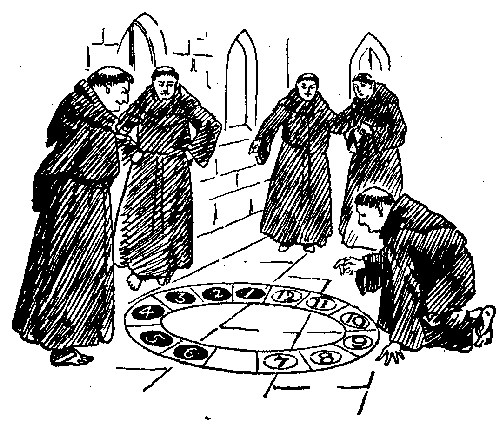 It would seem that the words "puzzle," "problem," "enigma," etc., did not occur in their vocabulary. They were accustomed to call every poser a "riddle," no matter whether it took the form of "Where was Moses when the light went out?" or the Squaring of the Circle. On one of the walls in the refectory were inscribed the words of Samson, "I will now put forth a riddle to you," to remind the brethren of what was expected of them, and the rule was that each monk in turn should propose some riddle weekly to the community, the others being always free to cap it with another if disposed to do so. Abbot David was, undoubtedly, the puzzle genius of the monastery, and everybody naturally bowed to his decision. Only a few of the Abbey riddles have been preserved, and I propose to select those that seem most interesting. I shall try to make the conditions of the puzzles perfectly clear, so that the modern reader may fully understand them, and be amused in trying to find some of the solutions.