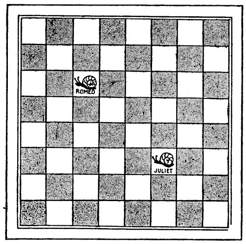 "It was a sheer stroke of luck on your part, Hawkhurst," he added. "Here is a much easier puzzle, because it is capable of more systematic analysis; yet it may just happen that you will not do it in an hour. Put Romeo on a white square and make him crawl into every other white square once with the fewest possible turnings. This time a white square may be visited twice, but the snail must never pass a second time through the same corner of a square nor ever enter the black squares."