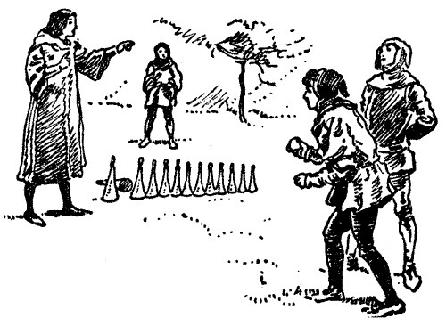 Nearly all of our most popular games are of very ancient origin, though in many cases they have been considerably developed and improved. Kayles—derived from the French word quilles—was a great favourite in the fourteenth century, and was undoubtedly the parent of our modern game of ninepins. Kayle-pins were not confined in those days to any particular number, and they were generally made of a conical shape and set up in a straight row.