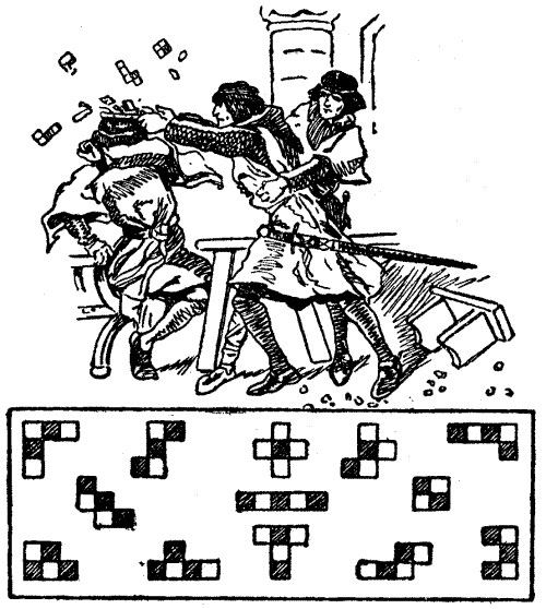 Now, tradition—on this point not trustworthy—says that the chessboard broke into the thirteen fragments shown in our illustration. It will be seen that there are twelve pieces, all different in shape, each containing five squares, and one little piece of four squares only.