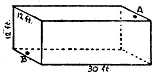 Inside a rectangular room, measuring 30 feet in length and 12 feet in width and height, a spider is at a point on the middle of one of the end walls, 1 foot from the ceiling, as at A; and a fly is on the opposite wall, 1 foot from the floor in the centre, as shown at B. What is the shortest distance that the spider must crawl in order to reach the fly, which remains stationary? Of course the spider never drops or uses its web, but crawls fairly.