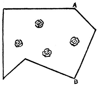 A good dissection puzzle in so few as two pieces is rather a rarity, so perhaps the reader will be interested in the following. The diagram represents a piece of bunting, and it is required to cut it into two pieces (without any waste) that will fit together and form a perfectly square flag, with the four roses symmetrically placed. This would be easy enough if it were not for the four roses, as we should merely have to cut from A to B, and insert the piece at the bottom of the flag. But we are not allowed to cut through any of the roses, and therein lies the difficulty of the puzzle. Of course we make no allowance for "turnings."