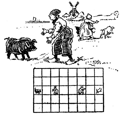 At the beginning of the game these must be placed on the squares on which they are shown. One player represents Hendrick and Katrün, and the other the hogs. The first player moves the Dutchman and his wife one square each in any direction (but not diagonally), and then the second player moves both pigs one square each (not diagonally); and so on, in turns, until Hendrick catches one hog and Katrün the other.