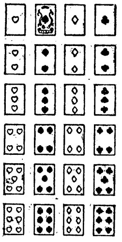 The cardsharper lays down the twenty-four cards shown in the illustration, and invites the innocent wayfarer to try his luck or skill by seeing which of them can first score thirty-one, or drive his opponent beyond, in the following manner:—