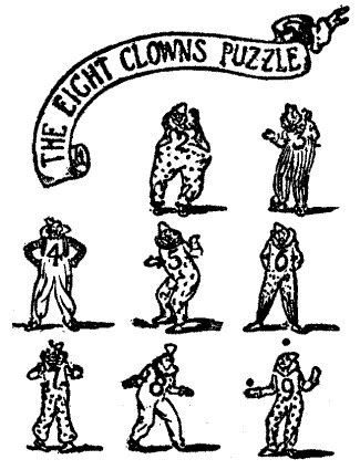 This illustration represents a troupe of clowns I once saw on the Continent. Each clown bore one of the numbers 1 to 9 on his body. After going through the usual tumbling, juggling, and other antics, they generally concluded with a few curious little numerical tricks, one of which was the rapid formation of a number of magic squares. It occurred to me that if clown No. 1 failed to appear (as happens in the illustration), this last item of their performance might not be so easy. The reader is asked to discover how these eight clowns may arrange themselves in the form of a square (one place being vacant), so that every one of the three columns, three rows, and each of the two diagonals shall add up the same. The vacant place may be at any part of the square, but it is No. 1 that must be absent.