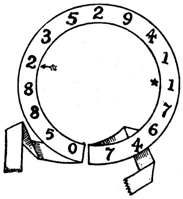 If we take the ribbon by the ends and pull it out straight, we have the number 0588235294117647. This number has the peculiarity that, if we multiply it by any one of the numbers, 2, 3, 4, 5, 6, 7, 8, or 9, we get exactly the same number in the circle, starting from a different place. For example, multiply by 4, and the product is 2352941176470588, which starts from the dart in the circle. So, if we multiply by 3, we get the same result starting from the star. Now, the puzzle is to place a different arrangement of figures on the ribbon that will produce similar results when so multiplied; only the 0 and the 7 appearing at the ends of the ribbon must not be removed.