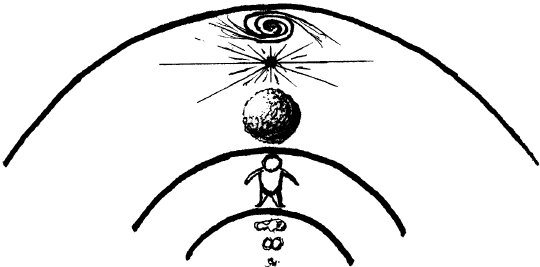Здесь вмешивается Катрин. Хорошенького понемножку. Для нас пришло время искать лекарство. Для начала посмотрим снова на нашу космическую иерархию, начиная с галактик и до кварков (или это «боцманы» Хигга?) с самим человеком, втиснутым или поставленным в самую ее гущу, прямо в сердцевине её или его тройной проблемы. Где в этом многоуровневом Космосе найдем мы Космическую Аптеку со средством от нашей тройной беды? Не упустил ли Дуглас что-нибудь существенное в своей картине, какой-нибудь уровень, на котором может скрываться волшебное лекарство?