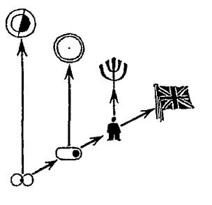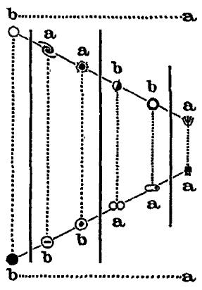 Учитывая эти общие соображения, давайте вернемся к вопросу о числе единиц на каждом иерархическом уровне. Я предлагаю выделить (довольно произвольно) два класса индивидов – (а) «многочисленные», многие тысячи или миллионы которых требуются для создания индивида следующего уровня, и (б) «немногочисленные», очень мало которых (а иногда и вовсе лишь двоих) достаточно для этой цели. Когда такое разграничение проделано, начинают появляться новые структуры. Например, мы можем заметить, что человеческая Пара (аа) вместе с наивысшей Парой (bb) составляют сверх-Пару; что земным Парам (ba) (bа) соответствуют небесные Пары (ab) (ab); что иерархия таким образом делится на четыре вертикальных отдела – божественный, небесный, земной и человеческий – с явной границей посередине между концентрической Землей, Жизнью и Человечеством с одной стороны и эксцентрическими небесными единицами с другой. Здесь, по крайней мере, есть намеки на лежащий в основе всего этого порядок, на неожиданные космические полярности.