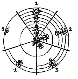 (Давайте я переведу эти результаты на язык нашей изначальной схемы областей, вызвав перемещающихся наблюдателей. В части I я привлекал одного-единственного наблюдателя, который начинал свое движение от человеческого тела или приближался к нему. Однако в части II стало ясно, что мое тело всемирное: таким образом, здесь, в части III, будет более уместным привлечь неограниченное число перемещающихся наблюдателей и отдать должное моему суммарному телу, начиная движение от Центров и повсеместно к ним возвращаясь – будь они земными, солнечными, галактическими или внегалактическими. Теперь эти множественные наблюдатели, завершив свою работу и сравнив свои полученные данные, обнаруживают, что, хотя их карты моих областей весьма разнообразны, они вовсе не хаотичны. В общем (безусловно, с некоторыми исключениями) число карт сводится к пяти – первая показывает все мои области; вторая показывает все области кроме человеческой Пары областей; третья – все, кроме человеческой и жизненной Пары; и так далее до пятой карты, которая показывает только мою электронную и галактическую область. Таким образом, все пять карт симметрично расположены вокруг одной оси, и все они следуют схеме иерархических Пар. Например, на третьей карте нет никакого барьера между молекулярной и планетарной зоной – молекула становится планетой, а планета – молекулой, напрямую, без какой-либо явной промежуточной стадии. Аналогичным образом, четвертая карта сводит вместе атом и звезду, а пятая – электрон и туманность. Иными словами, каждая последующая карта обозначает в качестве прямой метаморфозы, то, что на предыдущей карте было обозначено в качестве непрямой или промежуточной метаморфозы).
