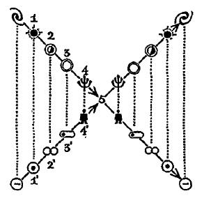 Я уже предоставил сведения о том, что Пары следуют генетическому порядку: наиболее крупные аспекты человеческой эволюции можно описать как разделение, в должном порядке, высших членов и одновременное объединение их низших членов. Теперь я хочу добавить, что один из основных тезисов этой книги (который будет еще дальше разработан в части V) состоит в том, что основные стадии тотальной эволюции человека повторяются основными стадиями процессов, посредством которых он впоследствии поддерживается – что, вкратце, порядок развития является порядком поддержания того, что развилось. Исторические стадии моей эволюции – солнечная, земная, жизненная и человеческая; и это также стадии тех более стремительных явлений, посредством которых я сейчас живу. Итак, я поддерживаюсь (1) энергией Солнца, которая, обработанная и впитанная внешними слоями планеты, становится (2) энергией Земли. Часть этой земной энергии (благодаря хлорофиллу) включается в состав (3) Жизни, а затем (претерпевая надлежащие изменения) и (4) в состав Человечества, которое питается Жизнью. Наконец, часть (еще более измененная) достается мне, (5) отдельному человеку. Однако данное описание, которое обращает внимание только на высший ряд, требует завершенности в виде низшего ряда. Меня поддерживает обмен энергии (Г) солнечных атомов, в ходе которого освобождается энергия – энергия, которая отчасти, благодаря фотосинтезу, становится частью (2’) определенных сложных земных молекул. А они идут на строительство (3’) клеток растений и животных, некоторых из которых съедают (4’) люди, которые тем самым получают энергию для той части, которая достается (5) отдельному человеку. Отметьте, как разделение высшего члена и объединение низшего члена идут наравне.