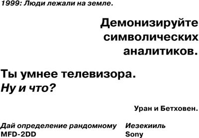 …Люди нашего возраста толпами уходят из компьютерных мегакультур, создают собственные компании или устраиваются в небольшие стартапы, занятые производством конкретного программного продукта. Начинается активный наем сотрудников… СМИ сходят с ума, а корпорации, которые в деньгах не купаются, скоро хватит апоплексический удар. Интеллектуальный дарвинизм!