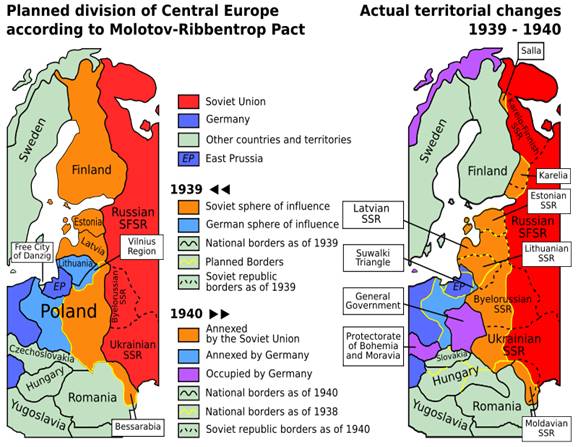 Территориальные трансформации в результате Пакта Риббентроп-Молотов 1939-1940. (Wikipedia – Ribbentrop Pact)