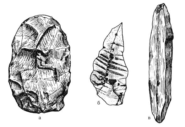 Рис. 1. Каменные орудия труда докерамических периодов: а — Ивадзуку, префектура Гумма, высота 8 см; б — Такей, префектура Гумма; в – Санва, префектура Хоккайдо, высота 15,5 см