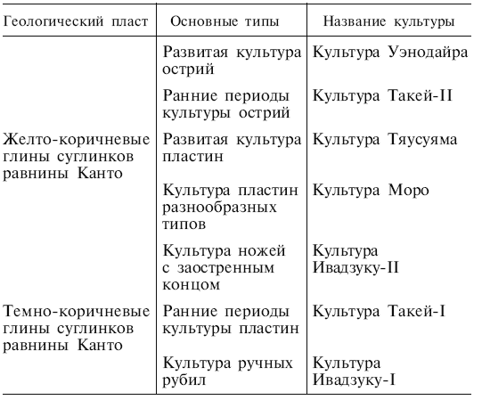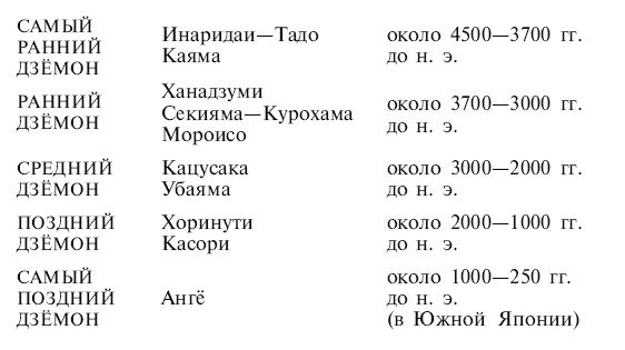 Деление эпохи Дзёмон на пять периодов объясняется таким ходом развития различных регионов Японии, при котором каждый из них последовательно пережил все стадии эволюции – о чем, кстати, свидетельствует и керамика, производившаяся в каждый из этих периодов. Это деление облегчило решение проблем взаимосвязей в каком-либо конкретном географическом регионе, которое свелось в основном к определению хронологической последовательности событий. Данная система деления хороша главным образом тем, что она дает возможность использовать удобную терминологию; однако идеализм этой системы едва ли компенсирует недостаток реализма. В настоящее время эту точку зрения разделяют почти все ученые, занимающиеся эпохой Дзёмон. Тем не менее – по крайней мере в том, что касается ранних периодов – существуют достоверные свидетельства того, что благодаря концентрации определенных типов в небольших ограниченных местностях происходили и параллельные эволюции этих типов. Поскольку точная и последовательная система хронологии требует наличия точной терминологии, мы дадим характеристику доисторической эпохи Дзёмон с помощью приведенной ниже краткой системы хронологизации. Используемые в ней названия взяты главным образом по аналогии с типами керамики, последовательно существовавшими на равнине Канто, – это объясняется тем, что данные типы керамики известны всем специалистам. Однако использование этих названий ни в коем случае не основывается на нашей убежденности в том, что развитие всех регионов Японии было одновременным. В данном случае они лишь обозначают уровень прогресса.