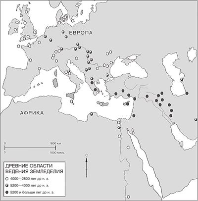 Случайно сохранившиеся свидетельства и направления исследований западных ученых до недавнего времени способствовали появлению такого положения вещей, что о древнем сельском хозяйстве на Ближнем Востоке и в Анатолии скопилось намного больше знаний, чем о земледелии на территории остальной Азии в доисторическом периоде. Тем не менее мы располагаем убедительными основаниями для того, чтобы определяющим районом считать как раз Ближний Восток. И предрасположенность условий, и собранные доказательства указывают на особое значение для развития земледелия области, позже названной Плодородным полумесяцем; речь идет о дугообразной территории, простирающейся на север от Египта до Палестины и Леванта, через Анатолию к холмам между Ираном и югом Каспийского моря, замыкая долины рек Месопотамии или нынешнего Ирака. Сегодня большая часть этого полумесяца выглядит совсем иначе: ничего не осталось от пышного пейзажа данной области, когда 5 тысяч лет назад климат здесь представлялся для растительности самым благоприятным. Тогда в Южной Турции рос дикий ячмень и злаки рода пшеницы, а долина Иордана давала богатые урожаи дикой пшеницы двузернянки сорта «эммер». В Египте в давние исторические времена выпадали достаточно обильные дожди для промысла крупной дичи, а в сирийских лесах за тысячу лет до н. э. все еще встречались слоны. Данная область сегодня все еще остается плодородной по сравнению с окружающими ее пустынями, а в доисторические времена она выглядела еще более манящей. Наличие злаковых трав, ставших предками более поздних зерновых культур, на этих землях прослеживается дальше всего в древность. В Малой Азии обнаружены доказательства сбора человеком урожая (хотя не обязательно культивирования) диких трав приблизительно за 9,5 тысячи лет до н. э. Вполне преодолимую проблему, похоже, представлял бурный рост лесов, начавшийся вслед за отступлением последнего ледникового периода; увеличение народонаселения могло активно стимулировать усилия по расширению жизненного пространства с помощью вырубки этих лесов для возделывания зерновых культур, когда угодий для охоты и собирательства стало явно недостаточно из-за демографического фактора. Приблизительно за 7 тысяч лет до н. э. новые продовольственные культуры и методы их возделывания должны были попасть в Европу. Налаживать контакты внутри этого региона, понятное дело, было относительно проще, чем за его пределами; обнаруженные в Юго-Западном Иране, но изготовленные из обсидиана, привезенного из Анатолии, оборудованные лезвием орудия труда ученые отнесли как минимум к 8-му тысячелетию до н. э. Но не стоит весь этот процесс списывать исключительно на рассеивание передовых навыков. Сельское хозяйство позже появилось в обеих Америках, причем явно без какого-то ввоза земледельческих приемов извне.