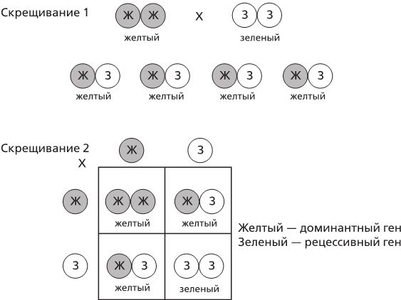 ГЕНЕТИКА, ПЕРВЫЙ КЛАССБольшинство из нас, знакомясь с генетикой в школе, слышали о Менделе и его экспериментах с гороховыми стручками. Грегор Мендель, монах-августинец и ученый, считается отцом-основателем современной генетики. Он выявил основные принципы генетики, занимаясь разведением зеленого горошка. Мендель наблюдал за тем, как наследуются семь разных характеристик растения (рост, форма стручка и его цвет, форма горошины и ее цвет, расположение и окраска соцветий). Так получилось, что каждая из этих характеристик определялась только одним геном. Например, цвет горошины мог быть одним из двух: желтый или зеленый. Когда Мендель скрестил «чистокровный» желтый горох с «чистокровным» зеленым горохом (см. скрещивание 1 на рисунке 3), он получил растения, семена которых были только желтого цвета. Зеленых горошин у них не было вообще. Главным событием эксперимента, которое помогло Менделю понять, что происходит, стало следующее: он скрестил полученные растения между собой (Скрещивание 2 на рисунке 3).