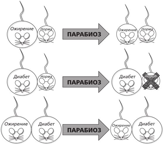 Провели три эксперимента. В первом ученый соединил мышь с ожирением и нормальную мышь. Он увидел, что с нормальной мышью ничего не случилось, а толстая сильно похудела. Во втором он соединил мышь, больную диабетом, и нормальную. На этот раз нормальная мышь перестала есть, потеряла вес и в конце концов умерла, а с больной ничего не случилось: она продолжала есть и не теряла веса. В третьем эксперименте «сиамскими близнецами» оказались мышь с ожирением и мышь с диабетом. Как и в первом случае, мышь с ожирением перестала есть и стала терять вес, а мышь с диабетом вела себя так же, как и до эксперимента[12]. Все это было очень странно.
