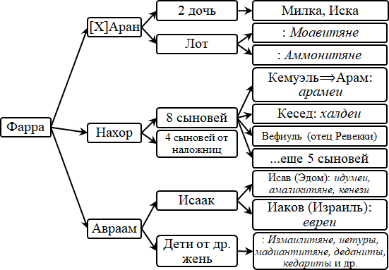Перейдём к Бытию: Позже Авраам по каким-то неизвестным причинам отделяется от остальных родственников и вместе со своей семьёй (женой и приёмным сыном – Лотом) покинув род, переходит за Иордан [в Ханаан] и начинает там заниматься скотоводством[19].