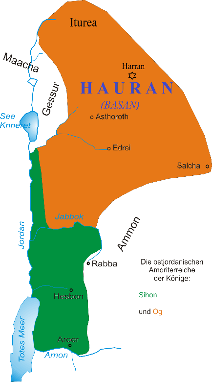 1) В кн. Моисея (Чис. 21:22, 26) пишется, что до прихода туда евреев Трансиордания принадлежала рефаимам. Перешла евреям по цепочке завоевании: «рефаимы ⤇ маовитяне / аммонитяне[Вт. 2:19–21] ⤇ аморреи ⤇ евреи»; Причём заявляется, что переход этой территории от моавитян и аммонитян к аморреям[13],[14] происходил недавно – при предпоследнем царе Моава (Чис. 21:26)[15].