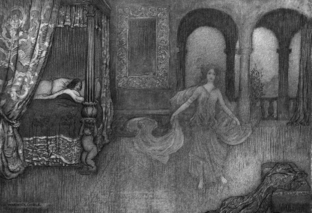 И вот принц с величайшей радостью велел принести вазу с веткой прямо к себе в покои и поставить на подоконник и стал окапывать и поливать ее своими руками. А потом случилось вот что: однажды вечером улегся принц в постель, слуги погасили свечи, и едва все вокруг утихло и все во дворце погрузились в первый сон, как услышал принц в доме шаги, будто кто ощупью потихоньку идет к его ложу.