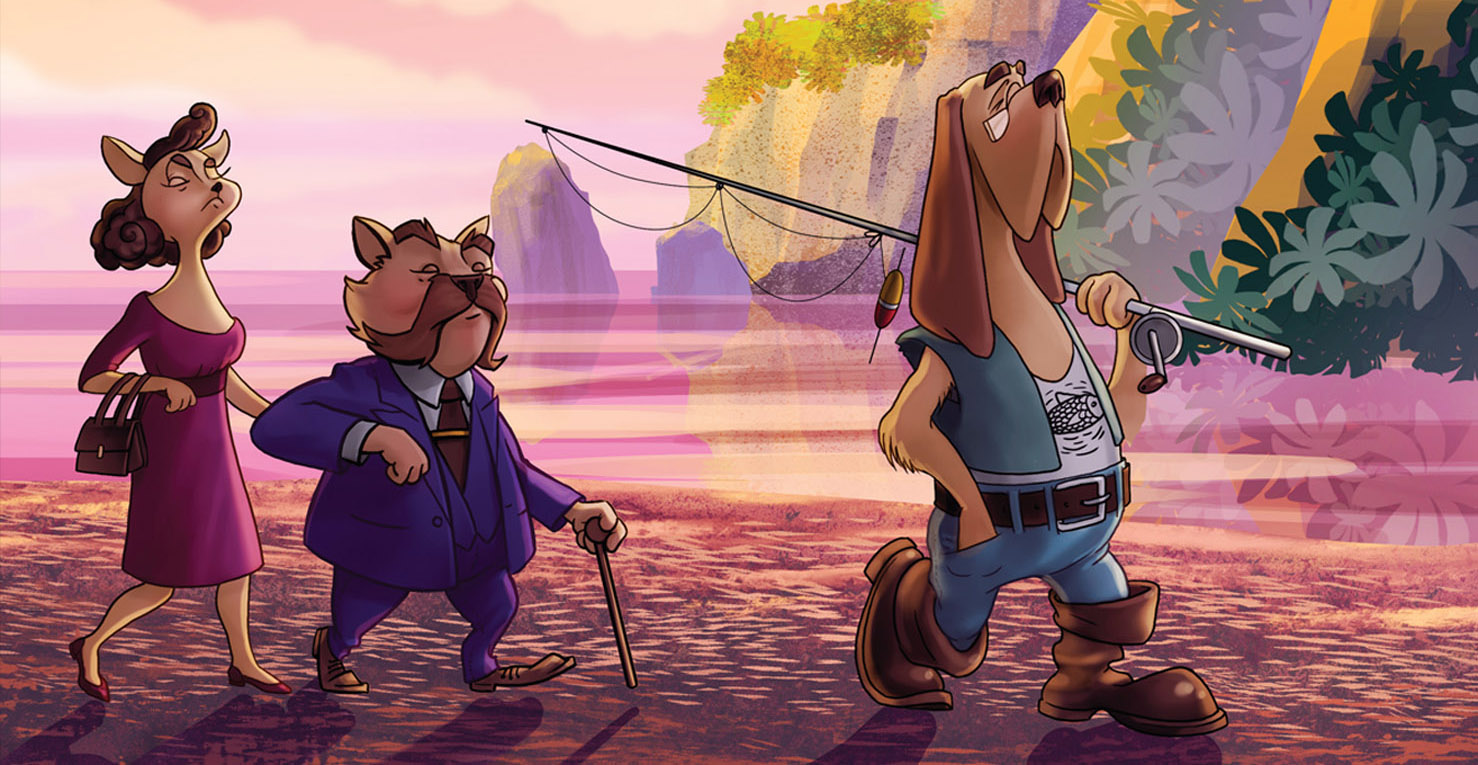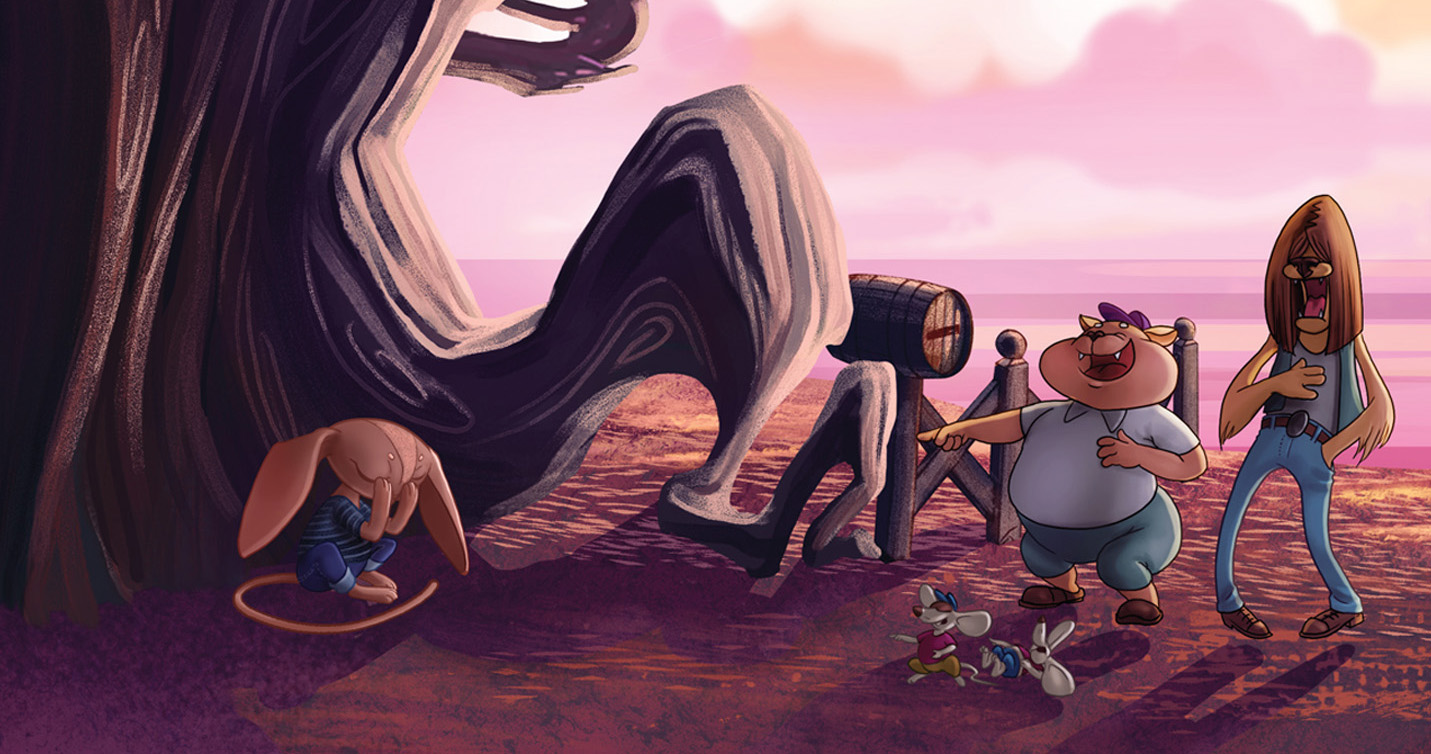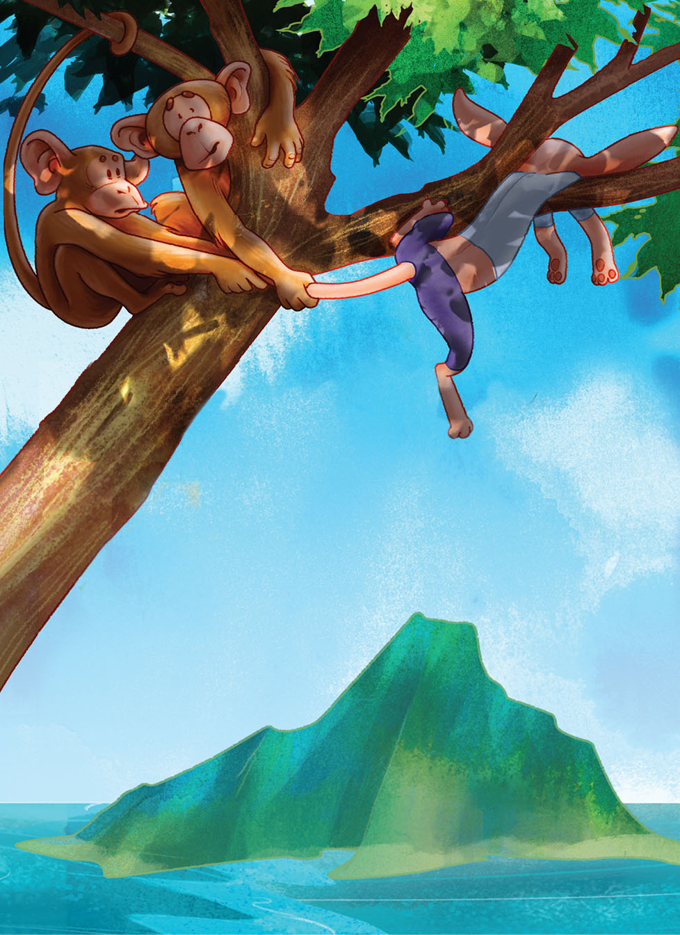 Often he got stuck between the branches. Upon his loud cries for help, the inhabitants of the island would all come together… Everyone helped as best as they could, while the monkeys pulled him by the tail.