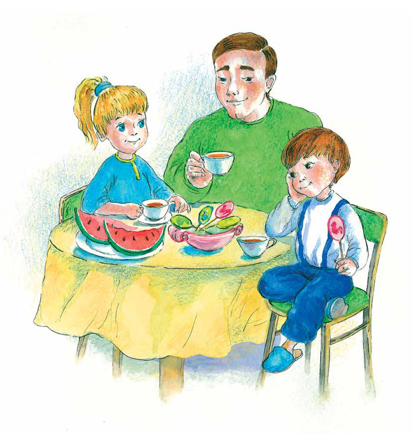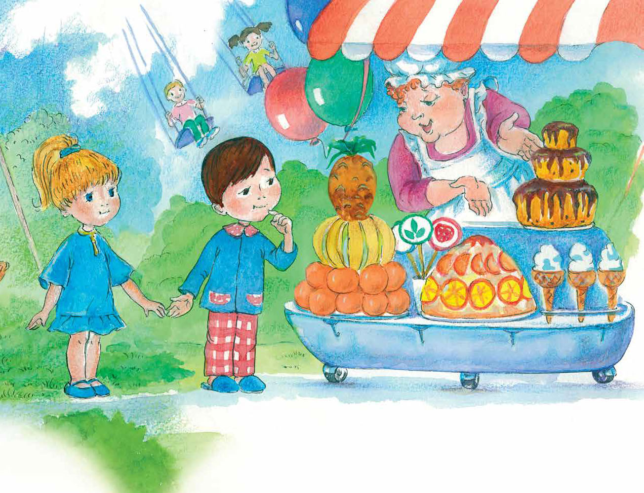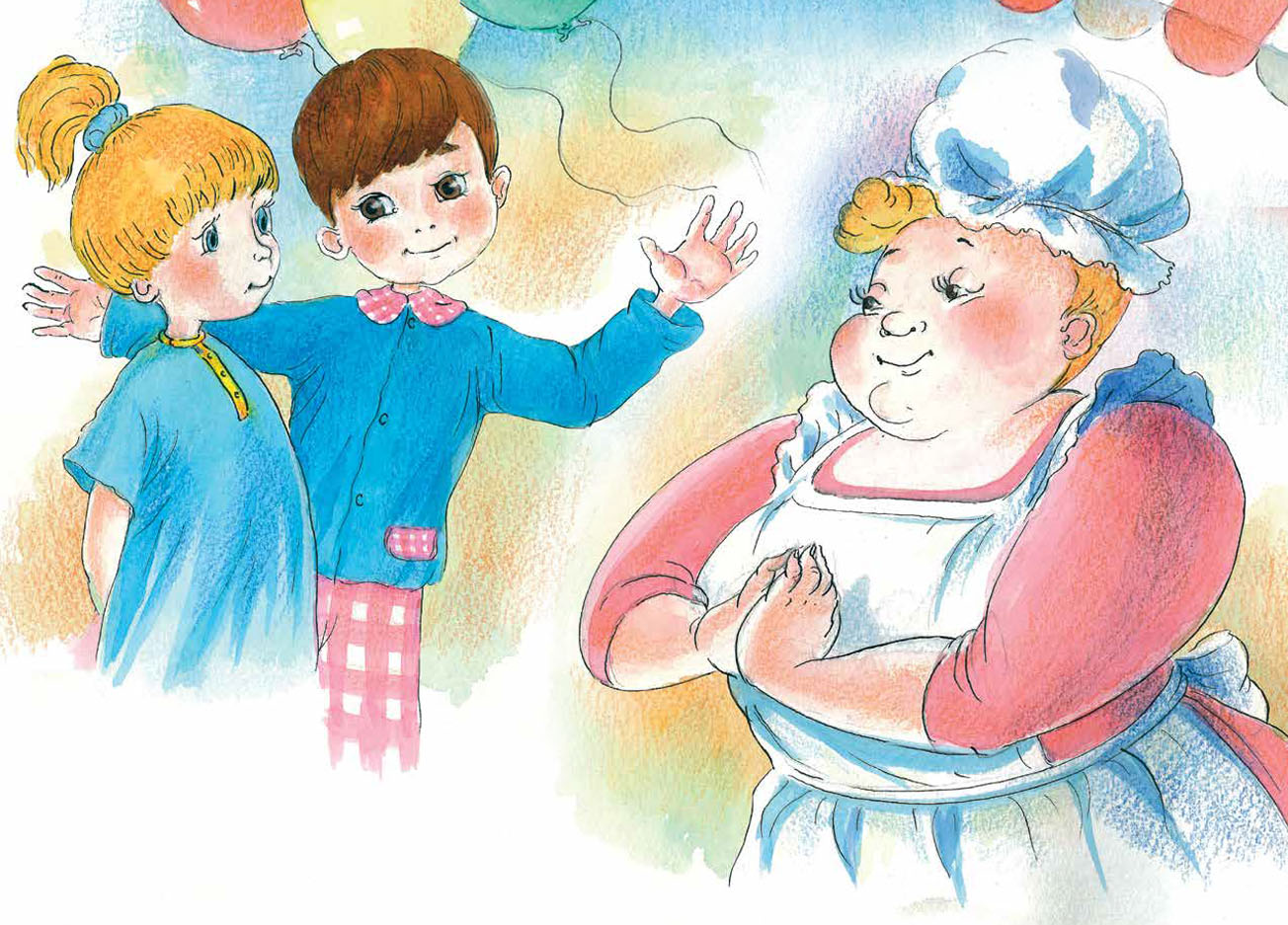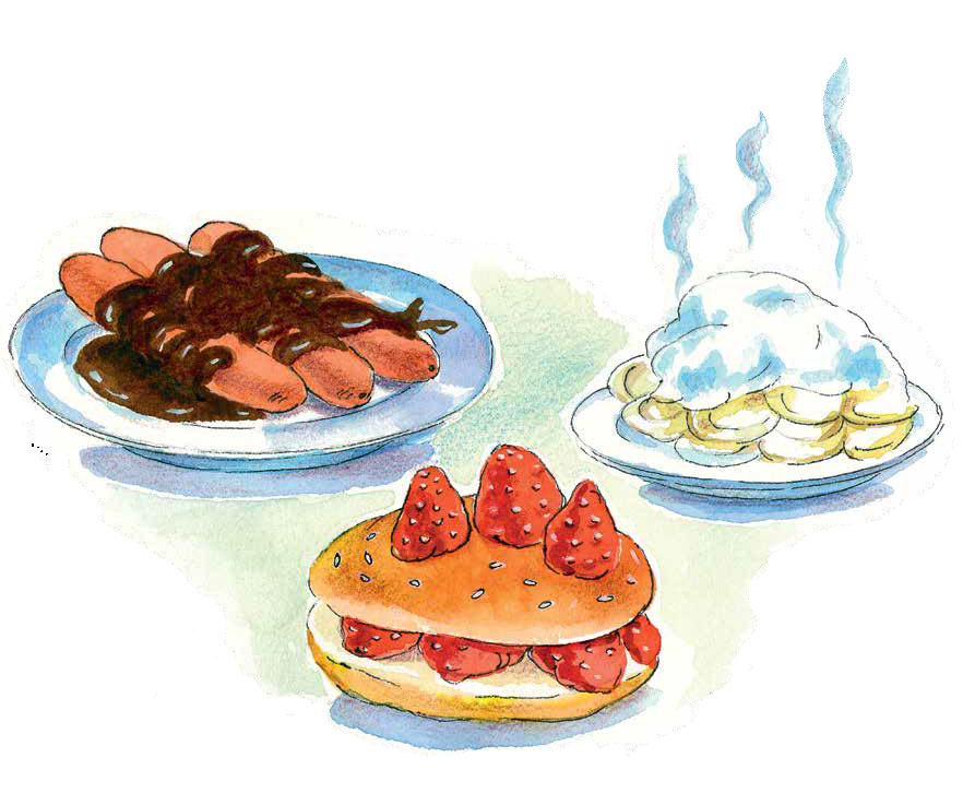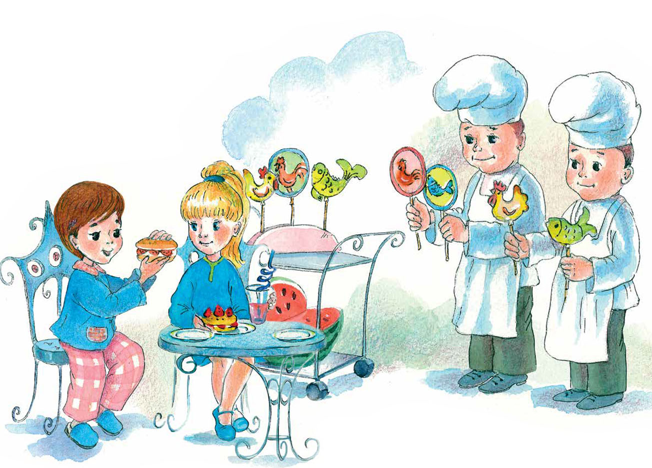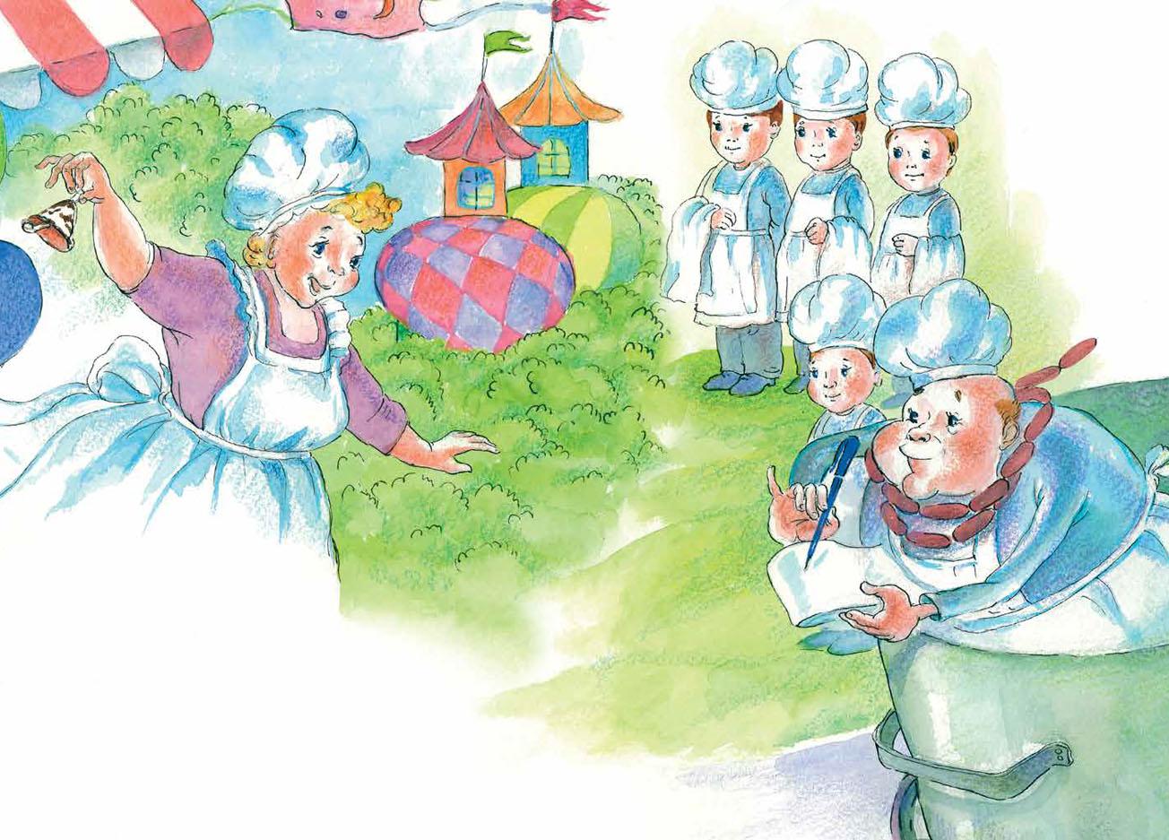The saleswoman didn’t bat an eye, and rang a gingerbread bell. Without more ado, in rushed a huge pot on wheels. From it sprang a chef who wore a necklace made of sausages, and ten assistants in ice cream caps. The order was taken!