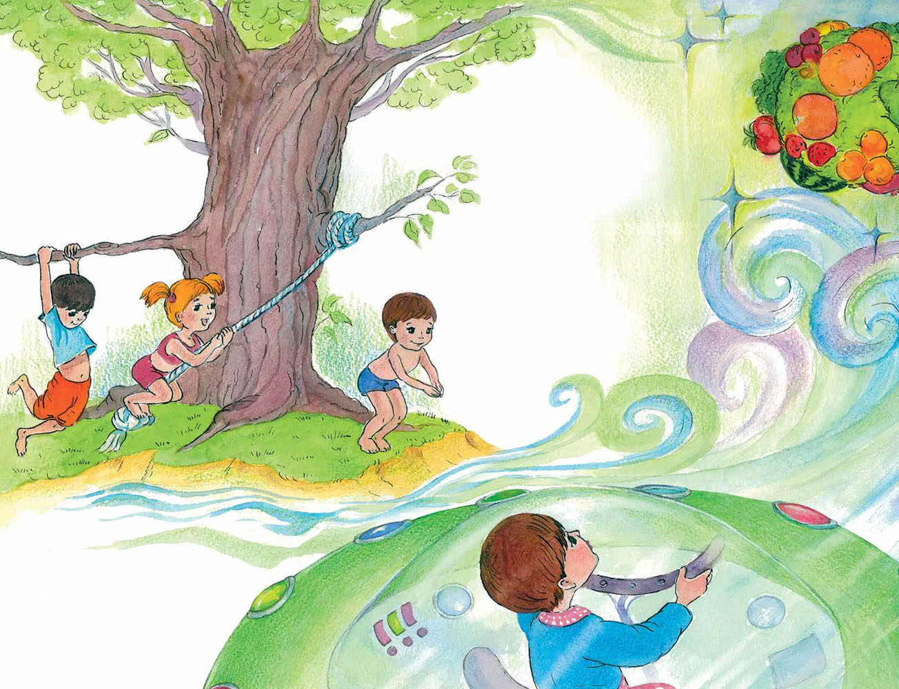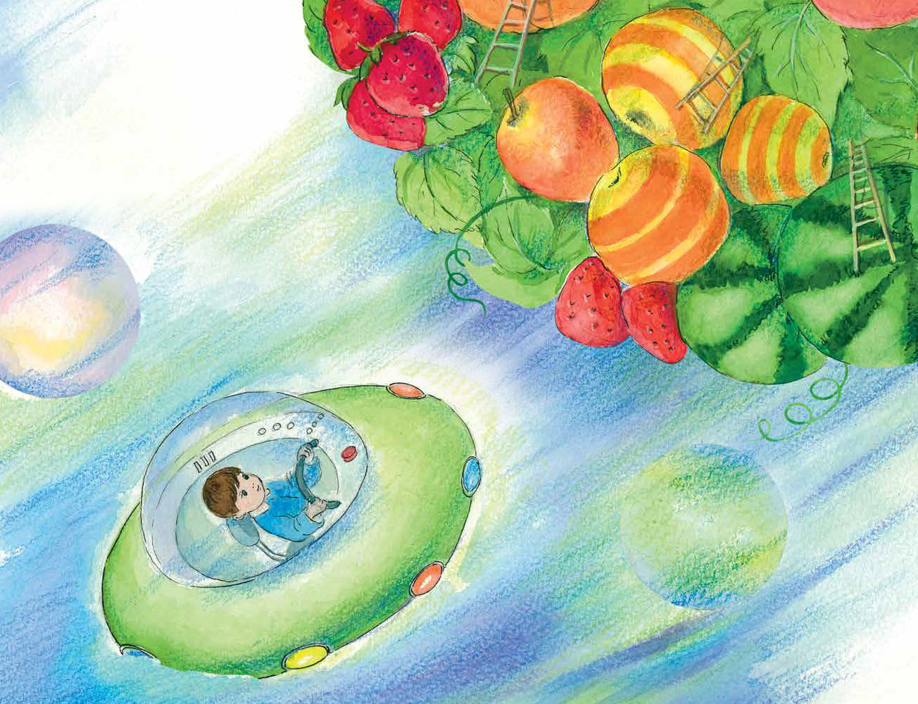 Daniyal marvelled at the view through the portholes. Multicoloured lights shone to the left and right, while in front the mysterious black sky was scattered with glittering stars. After a little flying around between the stars, the boy opened up the space map and realized that he was close to the planet of Giant Fruits and Vegetables.