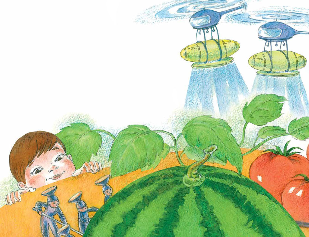 Immediately after arriving at the planet, Daniyal caught sight of some little men in shiny suits. The men got into helicopters and took off, and from a great height they watered the huge fruits and vegetables.