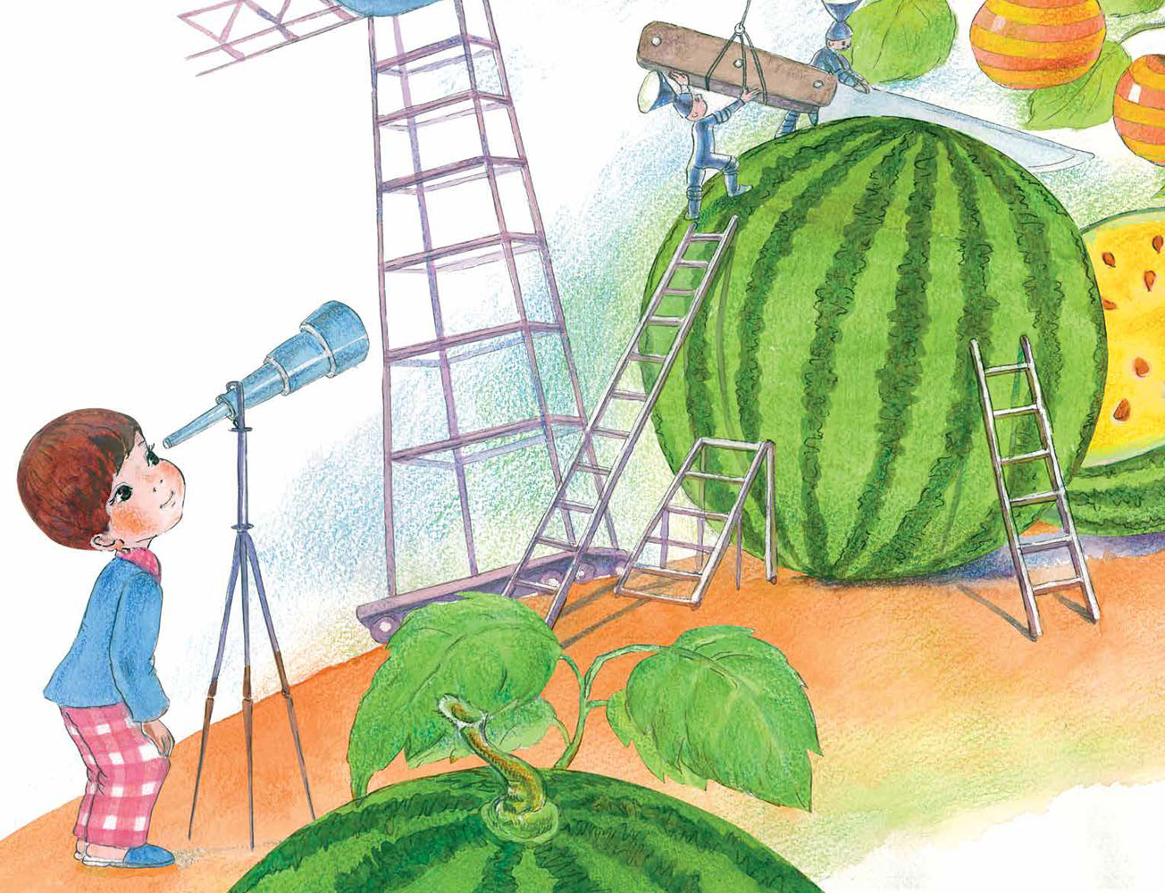 In the distance he noticed a whole mountain of watermelons. Looking through the telescope, Daniyal could see that some of the men were cutting up one of the huge watermelons with a knife attached to a crane. Inside the watermelons were yellow with red seeds.