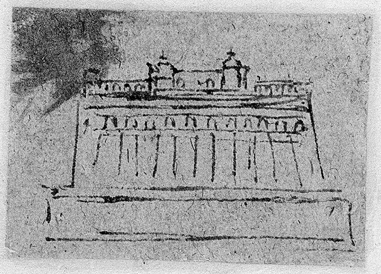 В Атлантическом кодексе на листе 153 мы видим несколько поспешный, но разборчивый набросок[6], на котором фасад дома, явно напоминающий его современный вид, пусть и без второго этажа, надстроенного позже, продолжается двумя боковыми приделами. Центральный корпус заканчивается двумя угловыми башнями, которые более подробно прорисованы на листе 395[7], с пирамидальными крышами, увенчанными фонарями. Два малых арочных придела отходят с обеих сторон от основного здания и заканчиваются двумя небольшими павильонами.
