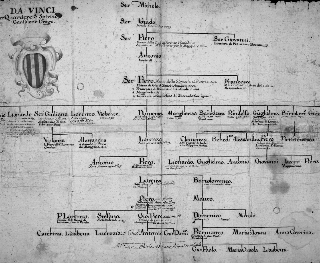 Колесо Фортуны принесло Леонардо гнетущую печать незаконнорожденного, а всему человечеству триумф искусства. Рожденный в законном браке, он вполне мог получить университетское образование и продолжить семейную традицию, став нотариусом. Действительно, генеалогическое древо семьи да Винчи, составленное в 1746 году и хранящееся в Риме в библиотеке Национальной академии деи Линчеи, показывает, что титул «сер», который присваивался профессиональным нотариусам, носили все его предки, начиная с сер Микеле, чье имя сохранила семейная память и который первым взял в качестве фамилии название родовой коммуны. Ему наследовал сын Гвидо, прапрадед Леонардо и владелец нотариальной книги, сберегаемой Антонио для своих семейных памятных записей, и его брат сер Джованни, все они были нотариусами. Внук Микеле сер Пьеро да Винчи, первый в роду, кто носил имя Пьеро, избрал в свою очередь ту же профессию и был нотариусом и секретарем Флорентийской республики и даже удостоился общественной должности. Его назначали послом в Сассоферрато в 1361 году и нотариусом Синьории в 1392 и в 1413 годах[35]. Сын сера Пьеро, Антонио, который отказался от семейной профессии и предпочел жить в окрестностях Винчи, хозяйствовал на своей земле и вел спокойную, счастливую жизнь. Женился он довольно поздно, взяв в жены Лючию, дочь сера Пьеро Дзози, нотариуса из Беккерето, и, когда родился его первенец Пьеро, ему уже было под пятьдесят лет и исполнилось почти семьдесят пять, когда он стал дедом Леонардо. Он был единственным в семье, кто отказался от семейной традиции, которую, напротив, продолжил его сын Пьеро, молодой честолюбивый нотариус, чьи успехи были почти сравнимы с теми, которых достиг его тезка-дед. Он начал свою практику в 1450 году и, набравшись опыта в Пизе, уже в 1451 году открыл свою нотариальную контору в Палаццо дель Подеста (ныне замок Барджелло) во Флоренции. Среди его клиентов были монастыри, религиозные ордены, еврейская община и однажды даже семья Медичи[36], что служило доказательством его деловой репутации.