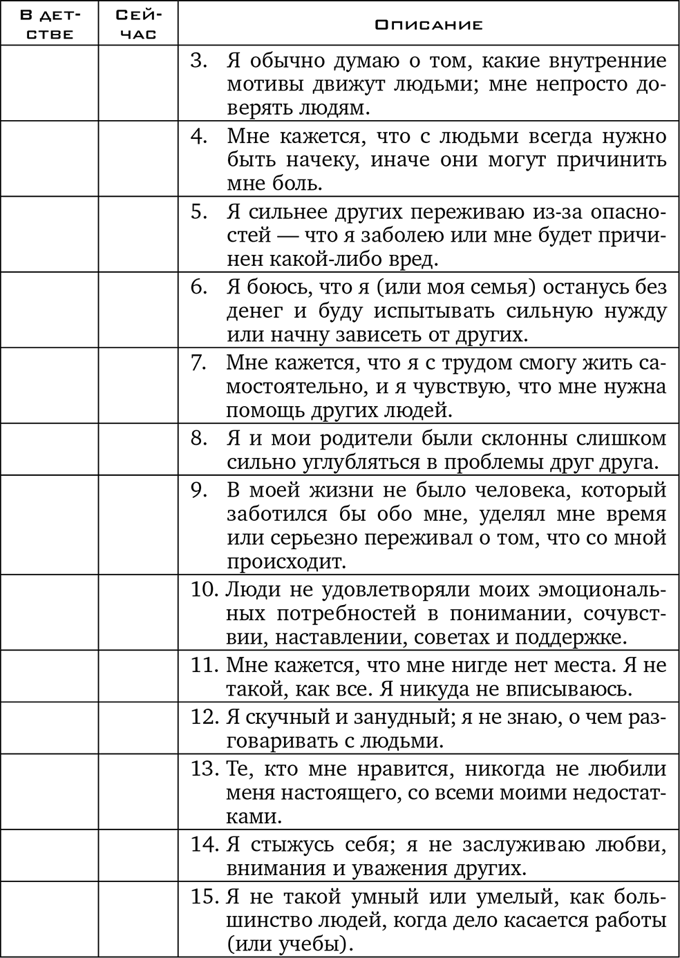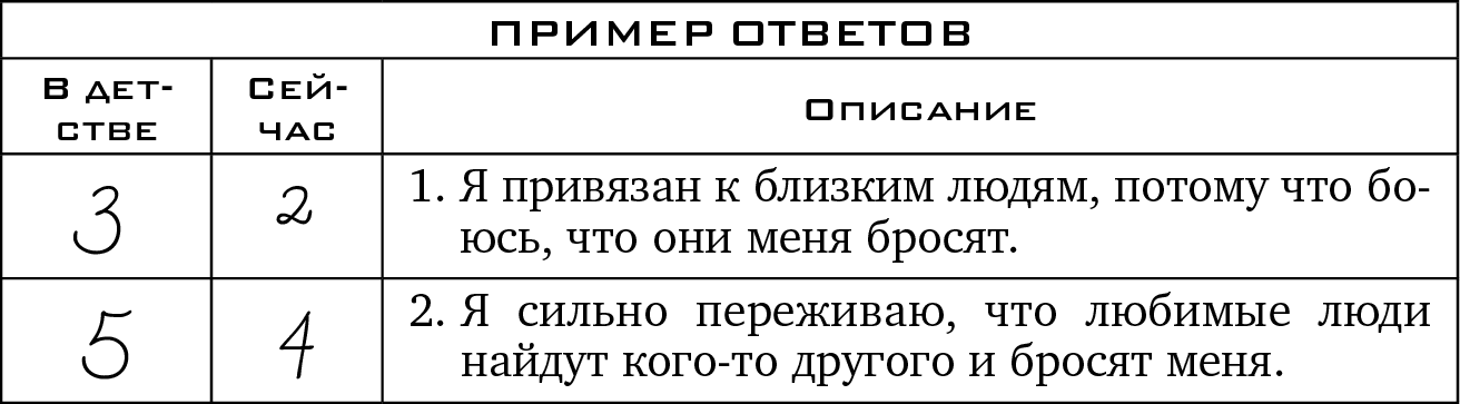 Вначале оцените, насколько точно это утверждение описывает вас, когда вы были ребенком. Если в разные моменты детства вы ответили бы по-разному, выберите значение, которое больше подходит для возраста до двенадцати лет. Затем оцените, насколько они верны для вас сейчас, во взрослом возрасте. Если в разные периоды вашей жизни ответ был бы разным, поставьте оценку в соответствии со своими чувствами в последние полгода.