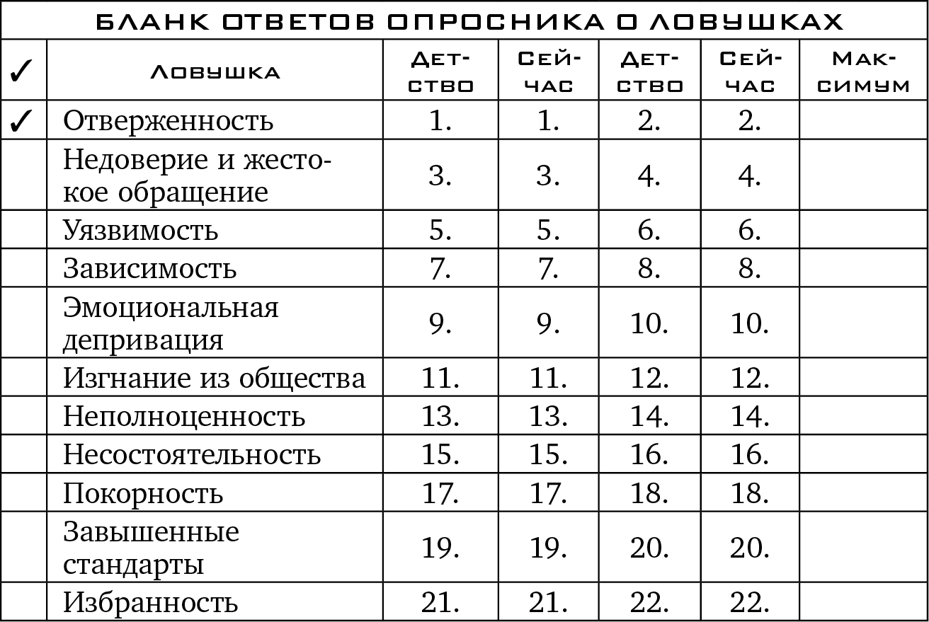 Если вы не уверены, применима ли ловушка к вам или вашим близким, не пытайтесь выяснить это прямо сейчас. В главах, посвященных конкретным ловушкам, мы даем более подробный тест, который вы сможете пройти, чтобы проверить, что относится именно к вам.