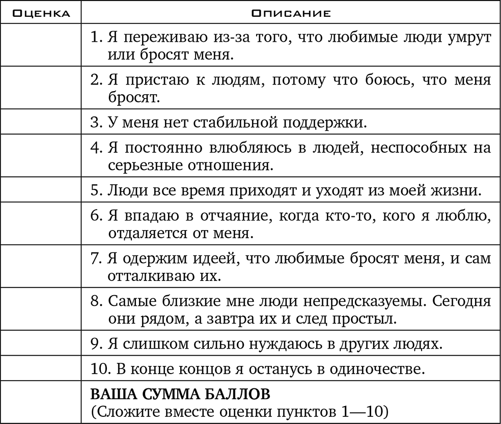 Этот опросник измерит силу вашей ловушки Отверженности. Оцените все пункты в соответствии со шкалой, приведенной ниже. Каждый пункт оцените так, как вы обычно чувствуете или ведете себя во взрослой жизни. Если в разные периоды взрослой жизни ваши чувства сильно варьировались, подумайте о последних двух годах, оценивая пункты опросника.