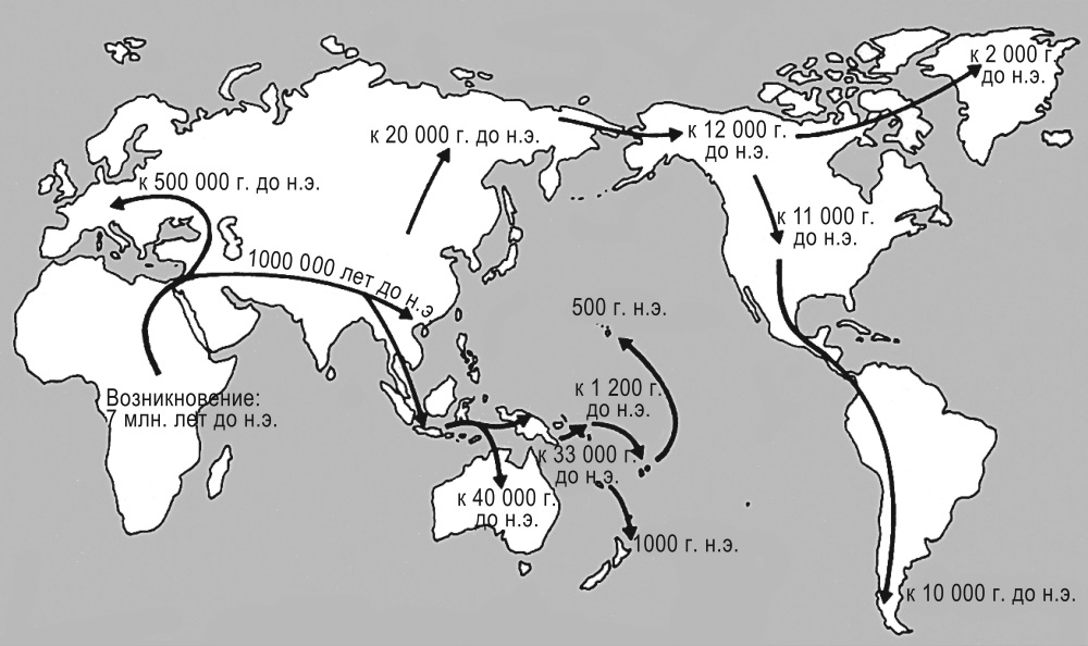 Нашими ближайшими родственниками на планете являются три ныне существующих вида высших приматов: горилла, обыкновенный шимпанзе и карликовый шимпанзе (известный также как бонобо). То, что ареалом распространения всех трех является Африка, а также масса ископаемого материала свидетельствуют о том, что начальные стадии человеческой эволюции происходили именно на этом континенте. Человеческая история как нечто отдельное от истории животных стартовала в Африке около 7 миллионов лет назад (существующие датировки разнятся от 5 до 9 миллионов лет назад). Примерно в это время популяция африканских приматов разделилась на несколько ветвей, одна из которых привела к формированию современных горилл, вторая – двух современных видов шимпанзе, а третья – человека. Предки горилл, вероятно, выделились в отдельную ветвь чуть раньше, чем разделились ветви шимпанзе и человека.
