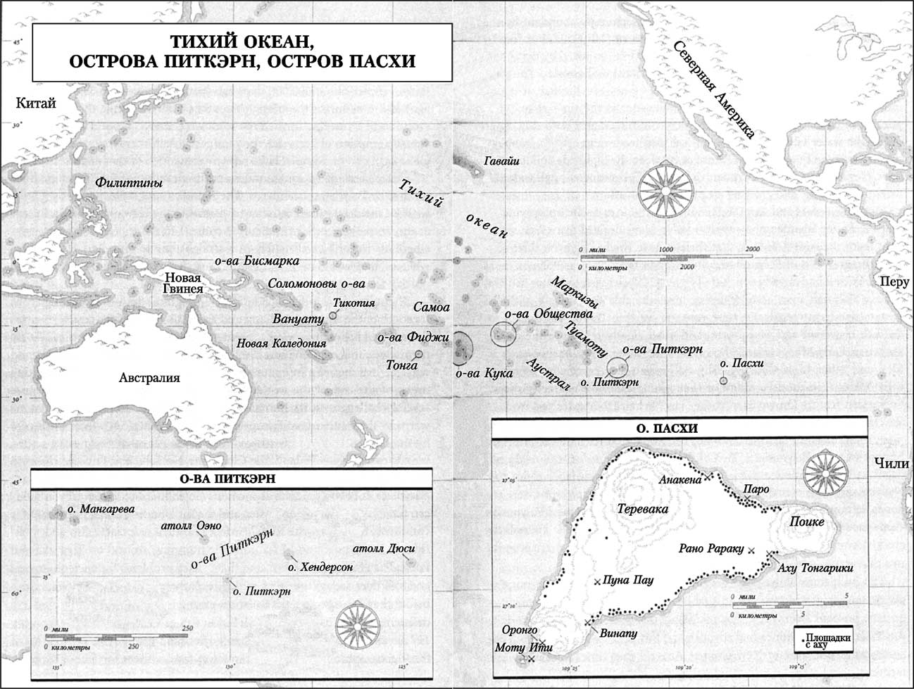 Ни одно из мест, в которых мне когда-либо довелось побывать, не производило на меня такого призрачного, нереального впечатления, как Рано Рараку – каменоломня на острове Пасхи, где вырубались знаменитые гигантские каменные статуи (илл. 5). Начать хотя бы с того, что этот остров является самым удаленным обитаемым клочком суши на планете. Ближайшая земля – это побережье Чили, на расстоянии 2300 миль к востоку, и группа островов Питкэрн в Полинезии, в 1300 милях на запад (см. карту 3). Когда в 2002 году я прибыл на самолете из Чили, мой полет над бескрайними, от горизонта до горизонта, просторами Тихого океана длился более пяти часов, и на всем протяжении полета под нами, кроме водной поверхности, не было абсолютно ничего. К тому моменту, когда далеко впереди, на освещенной косыми закатными лучами водной глади появилась едва различимая глазом точка, оказавшаяся островом Пасхи, я уже начал беспокоиться, сможем ли мы до наступления темноты найти остров, и достаточно ли запасов топлива на борту, чтобы вернуться в Чили, если мы промахнемся и не достигнем цели нашего полета. Кажется совершенно невероятным, что этот остров мог быть открыт и заселен кем-либо из людей до появления в этих краях больших и быстроходных европейских парусных судов.