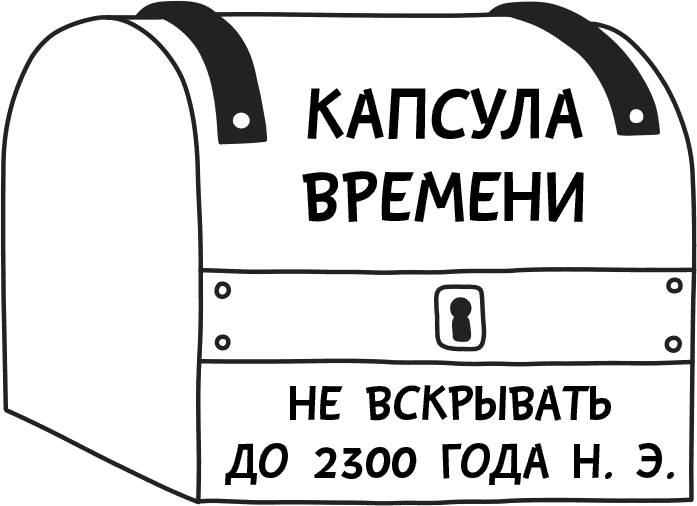 ТОГДА мне пришла в голову совсем ДРУГАЯ идея. Я видел по телику, как учёные сделали «капсулу времени» и наполнили её газетами, DVD и всякой такой ерундой. А затем зарыли капсулу в землю. Суть дела в том, что через несколько сотен лет кто-нибудь найдёт эту капсулу и поймёт, как люди жили тогда, когда её закапывали.